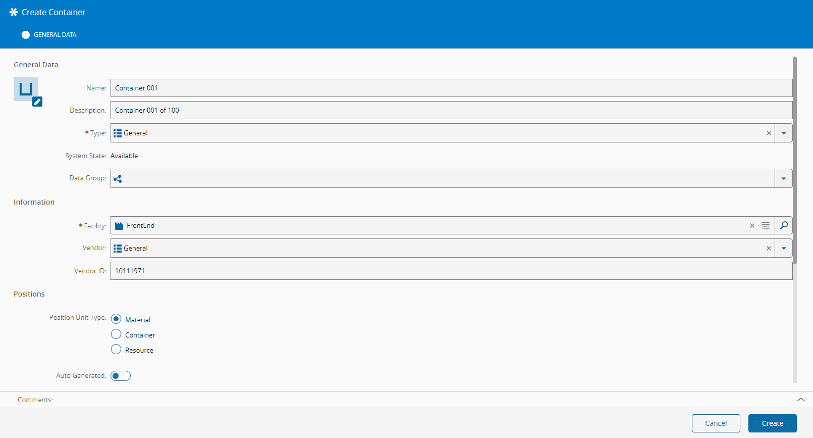 - When changing the properties Position Unit Type or Allow Mixed Types, the Used Positions must be zero, that is, the Container must be empty (without Materials or Containers).