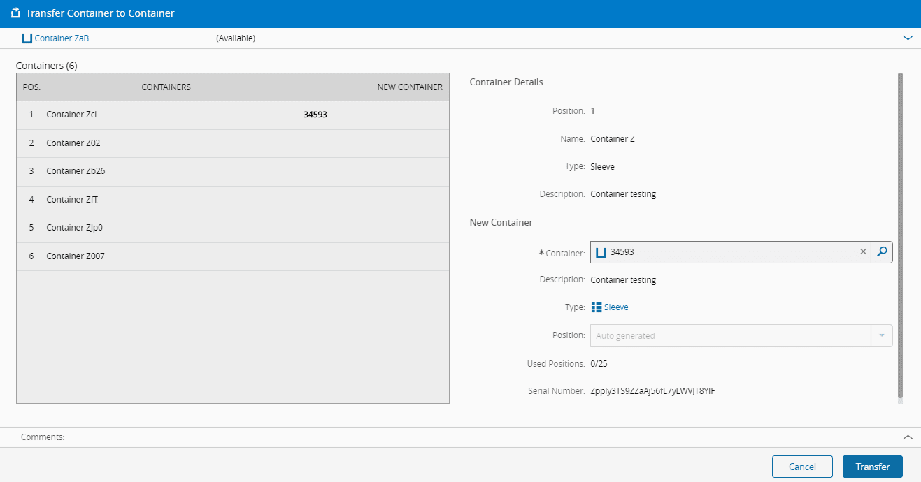 - For each Container in the Container to be transferred, it is necessary to specify a new Container. If the new Container does not auto-generate positions, it is necessary to specify the position in the Container, otherwise the position will be generated automatically.