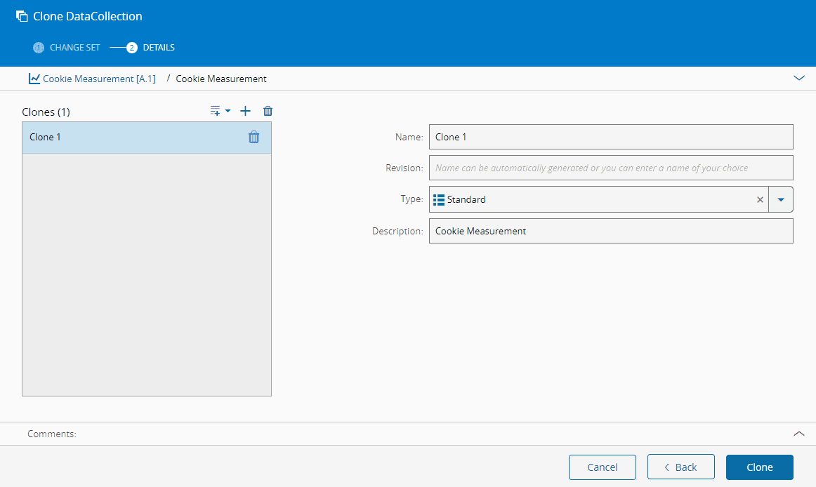 The Clone Data Collection wizard can be called from the Data Collection page within the Business Data Group. The default values will be taken from the current Data Collection to be used as a base for the new object. Since this is a versioned entity, there are two possible procedures: entity and revision cloning, both of which are available from the main details page. Select Clone on the top ribbon, followed by Entity if you want to clone the complete entity along with the first revision and version of the new entity, or Revision if you want to clone only a single revision. In either case, a Change Set must be supplied for a version of the revision to be made effective in the future.