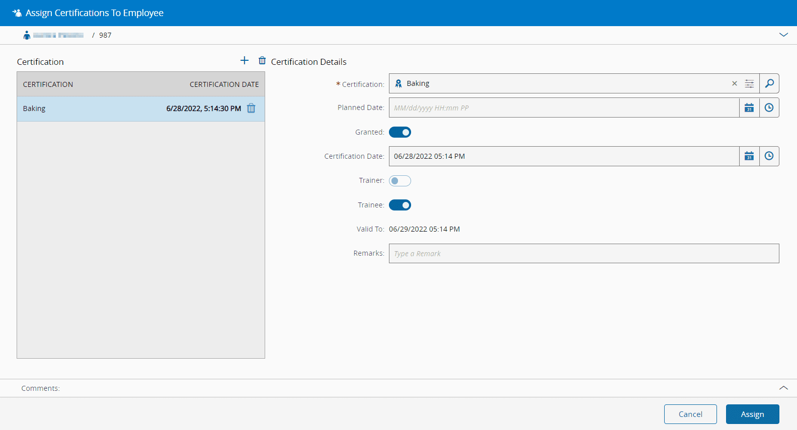 Certification Date + Training Maximum Duration. - Optionally enter a remark for the assignment.