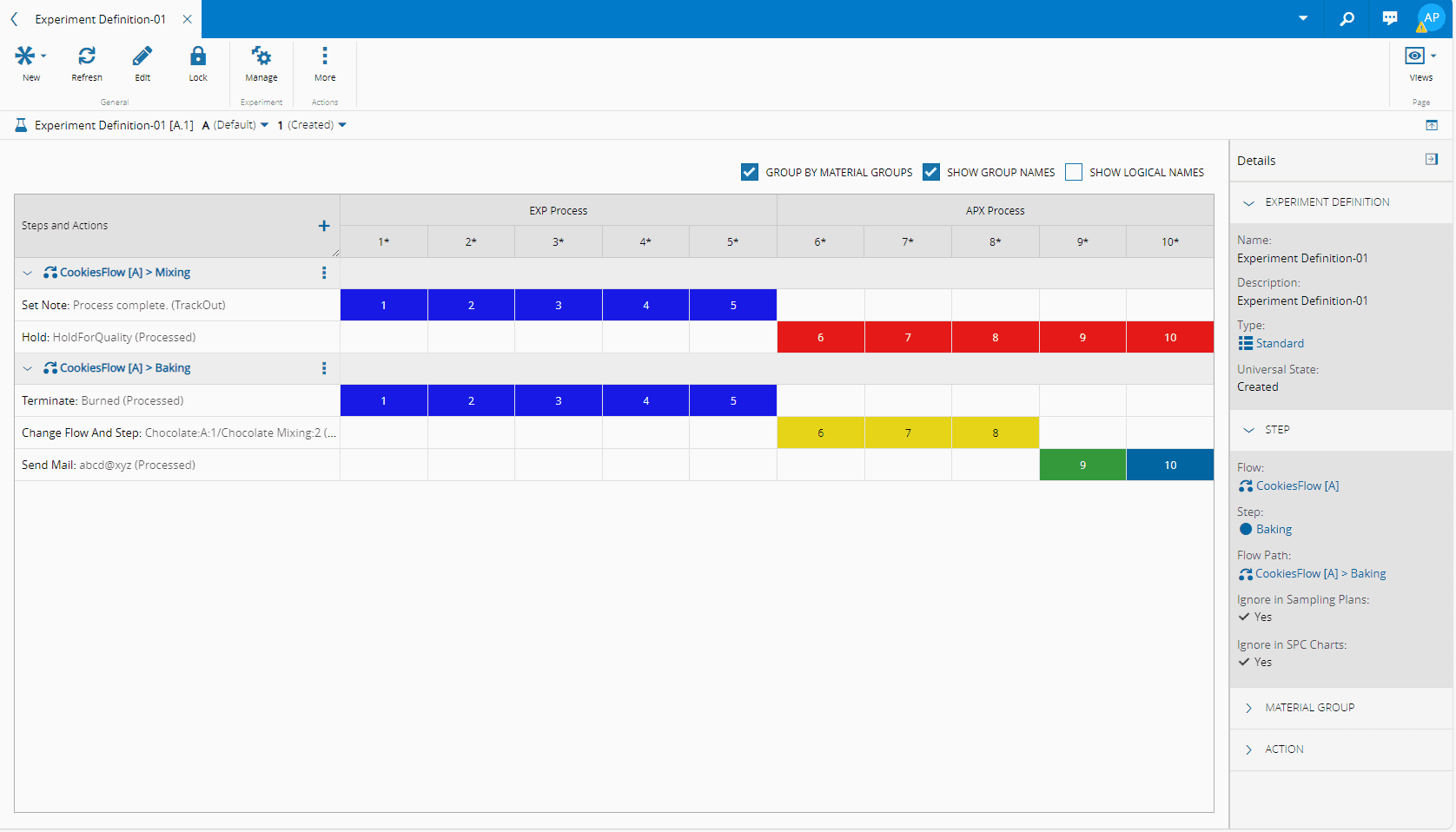Different colors are associated to common groups of materials throughout the whole Step actions.