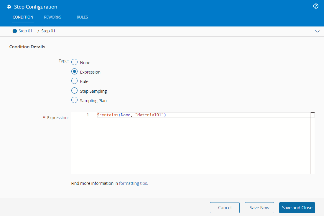 Requires a Case Sensitive expression in JSONata ⧉ that evaluates the state of the Material and returns true or false. This expression can reference direct properties, attributes, and characteristics of the Material, as well as properties of its Product, Product Group, and Step. Some examples are: