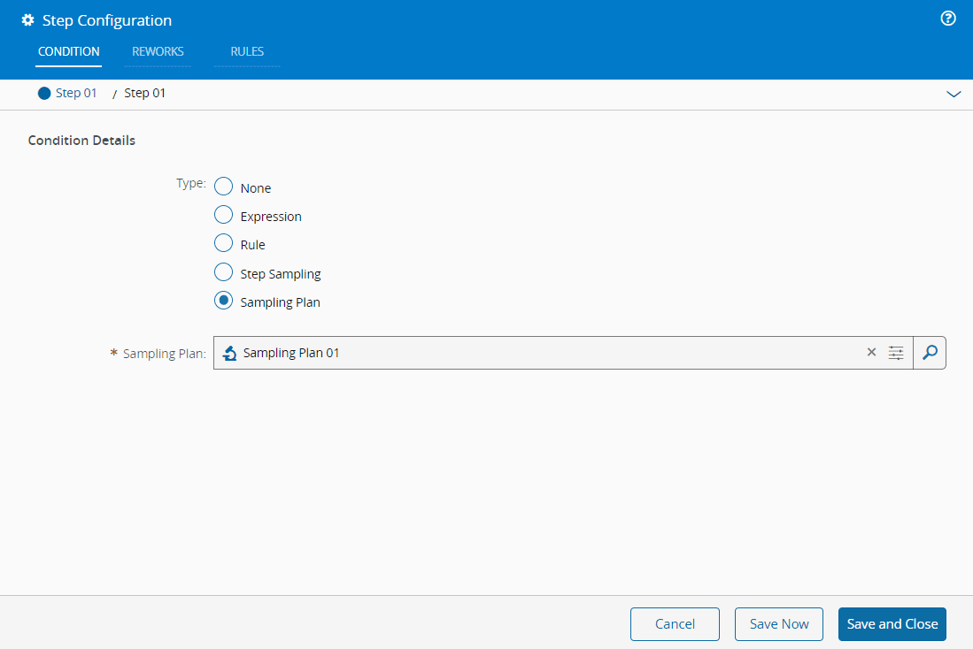 The Sampling Plan condition applies a specific Sampling Plan directly to a Step. When this condition is set, CM MES selects Materials for sampling based on the plan’s frequency rules (counter-based or time-based) and processes them in that Step.