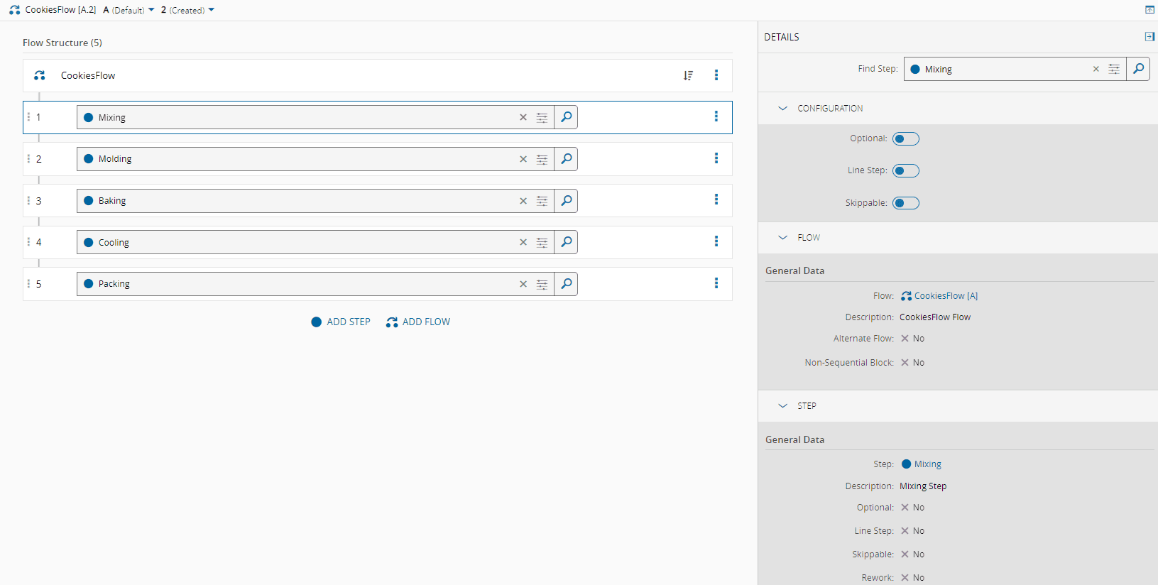 Optional Flow Items, whether Step or Flow, can be skipped during the process. The decision to skip is made when moving the Material to the next Flow or Step, either manually or via a business rule.