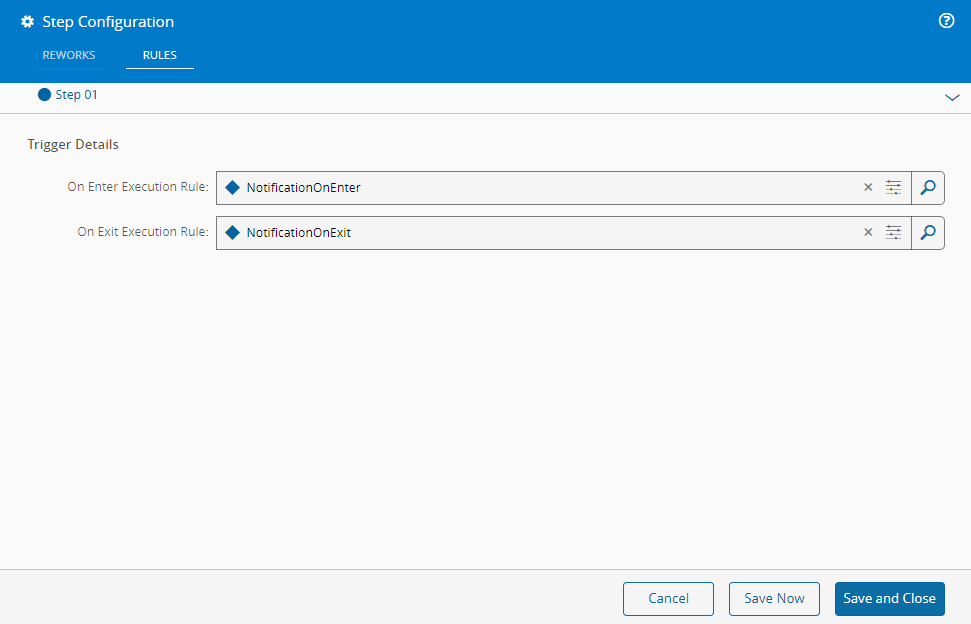 You can define Rules to be run when a Material enters or exists a Step. These Rules are linked to DEE Actions, enabling you to execute custom code to be triggered when entering or exiting a specific Step. The management of these Rules is handled by the Flow structure. In the Edit Flow Structure view, you can select a Rule with the scope Material Tracking to be executed for Enter and Exit events of Flow Items of type Step. This functionality is controlled by the On Enter Rule and On Exit Rule properties of the Flow Item.