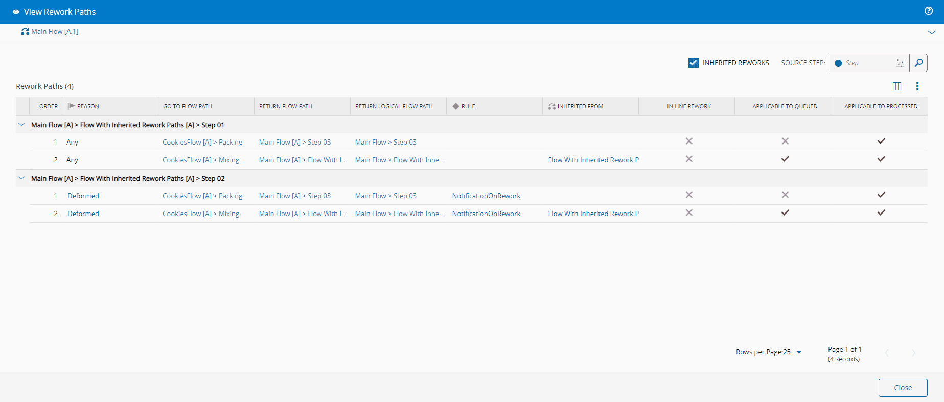 A wizard will appear with all the information regarding the Rework Paths, which can be filtered by the Inherited Rewords or the Source Step, as shown in the image below.