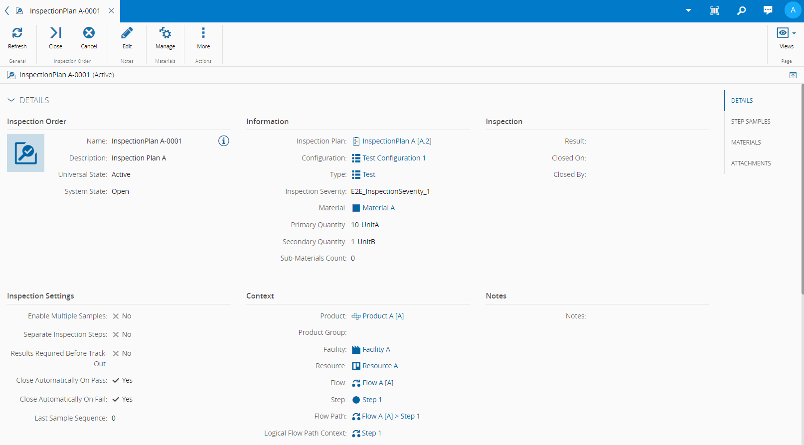 - Step Samples - displays information on the Step Material Samples associated to the Inspection Order.