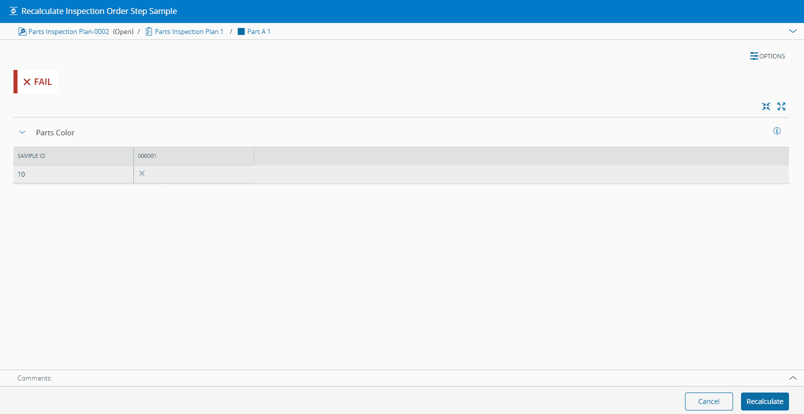 • Step Sample to recalculate is associated to the Inspection Order and is Open.