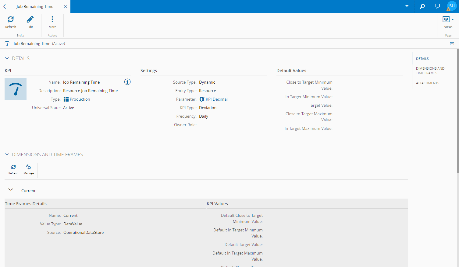 - Dimensions and Time Frames - displays information on the dimensions and time frames that compose the KPI.
