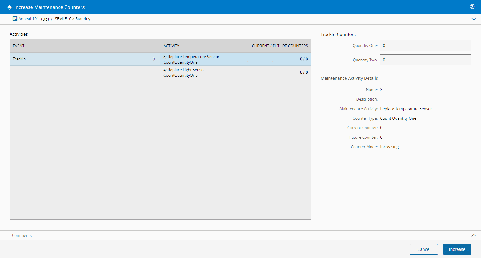 The Increase Maintenance Counters wizard can be called from the Resource, the Container or the Area page within the Business Data Group.