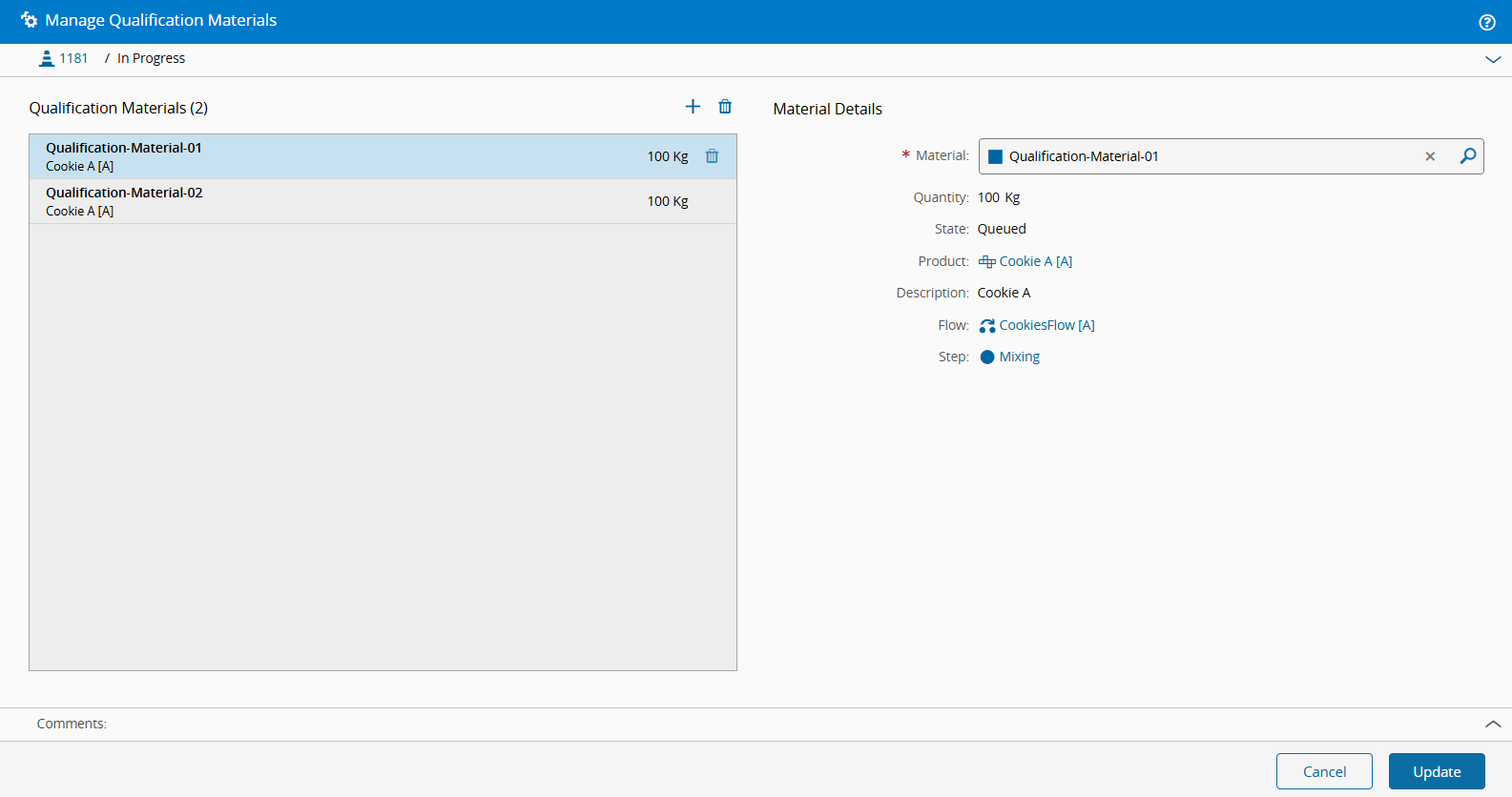 - In the Manage Qualification Materials wizard, assign or unassign the required Materials using the and icons. When a Material is selected, its details are displayed in the panel below. If no Materials are available for selection, review the preconditions described above.