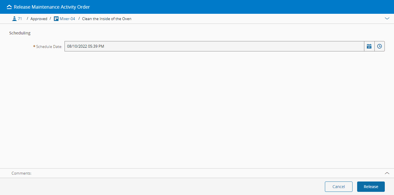 This operation releases a Maintenance Activity Order (MAO) which is in the Approved state. A released MAO can be initiated at any time. If the Maintenance Activity is configured to be automatically released, this operation is not necessary.