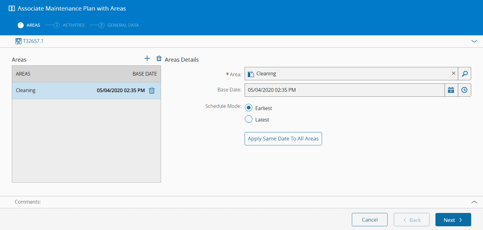 The Associate Maintenance Plan with Area operation associates one or more Areas with a particular Maintenance Plan.