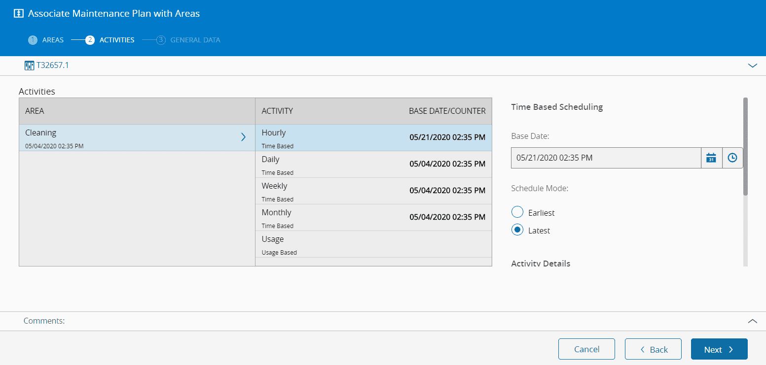 - If wished, specify customized the Base Date and Schedule Mode for any of the Maintenance Activities that belong to the Maintenance Plan.