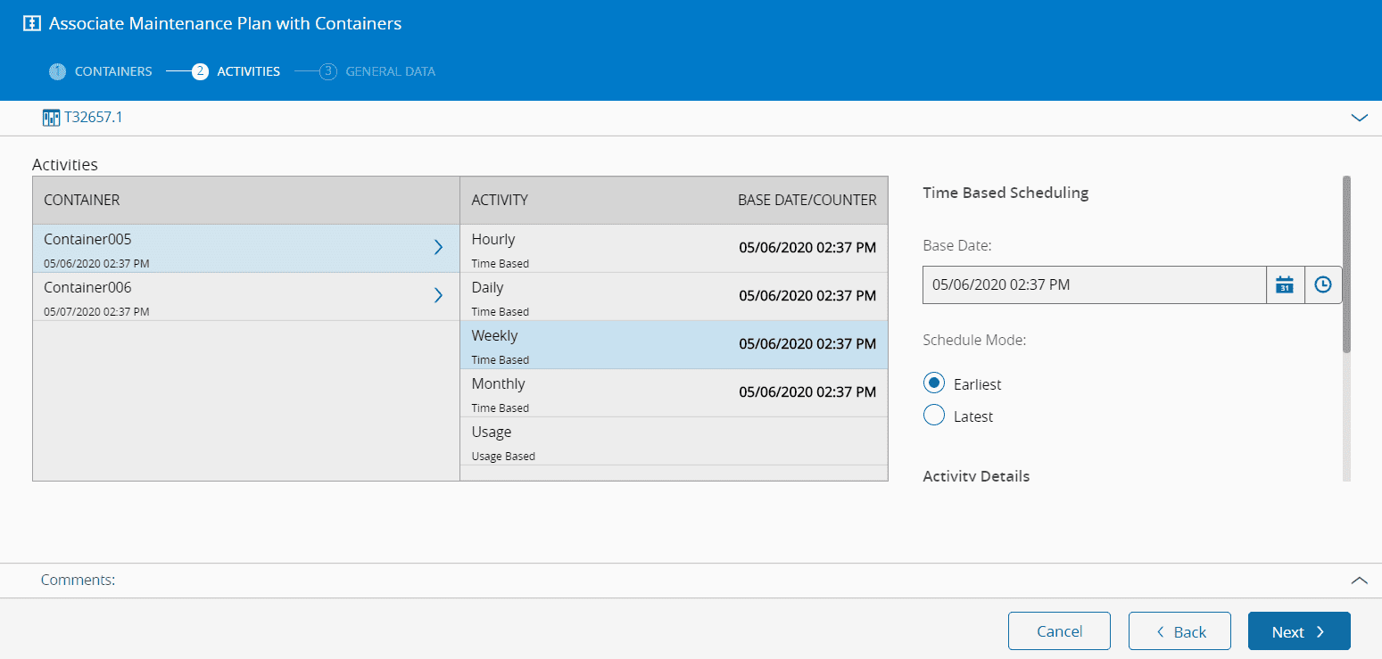 - If wished, specify customized the Base Date and Schedule Mode for any of the Maintenance Activities that belong to the Maintenance Plan.