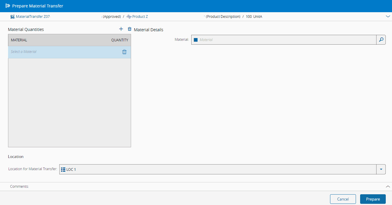 2. Optionally, select a location for the Material Transfer (from the Lookup Table MaterialLocation).