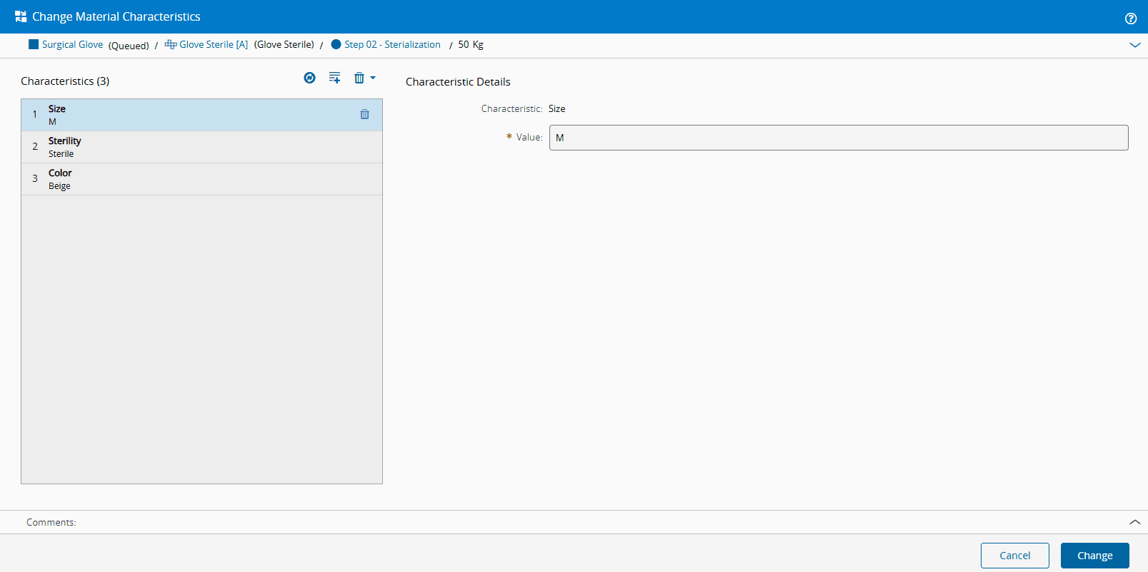 Change the value of the existing Material Characteristics. For this operation, you must provide a value for each characteristic, either by entering manually as free text or by selecting a predefined value from the specified Source Lookup Table.