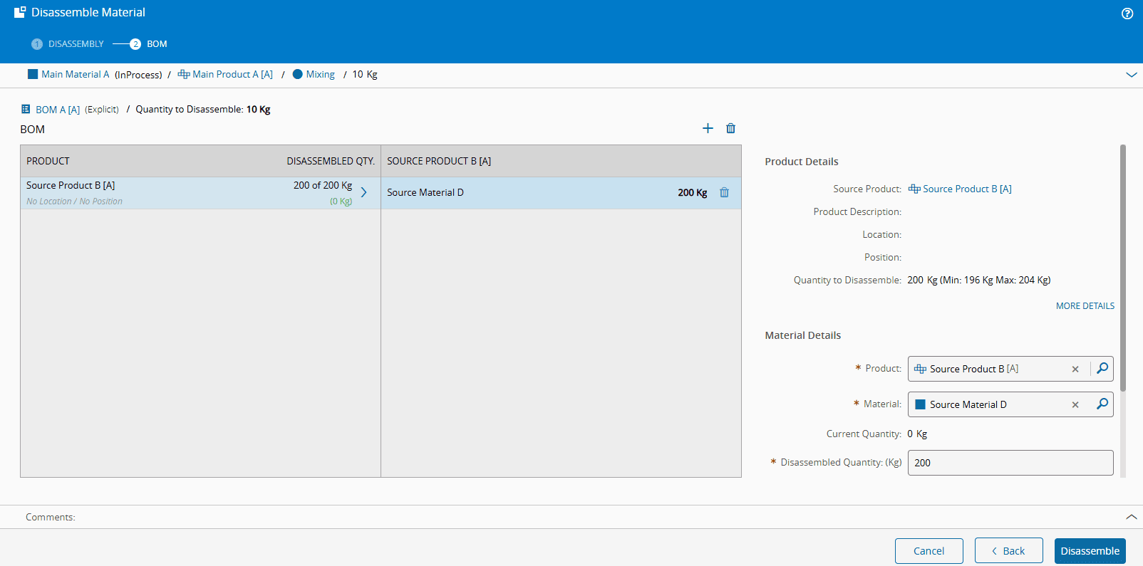 - Verify the Material and BOM information and select Disassemble.