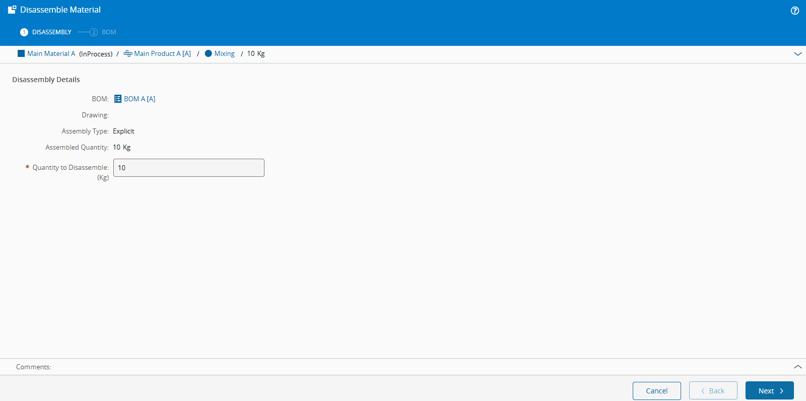 - Specify the quantity of Material to disassemble and select Next. Note that the Material primary quantity will be reduced accordingly and that required quantities will be automatically calculated based on the BOM definition.