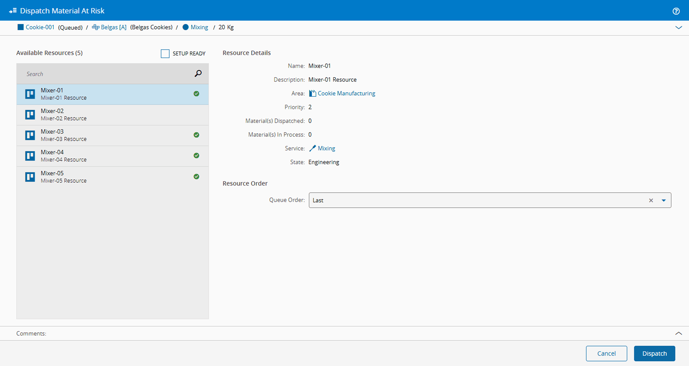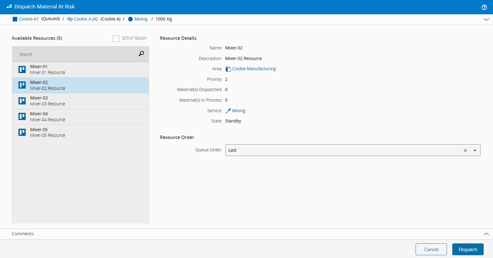 2. In the Available Resources list, choose a Resource to dispatch the Material to. The chosen Resource must have the desired Material in the Run At Risk Materials list. For more information, see Manage Run At Risk Materials.