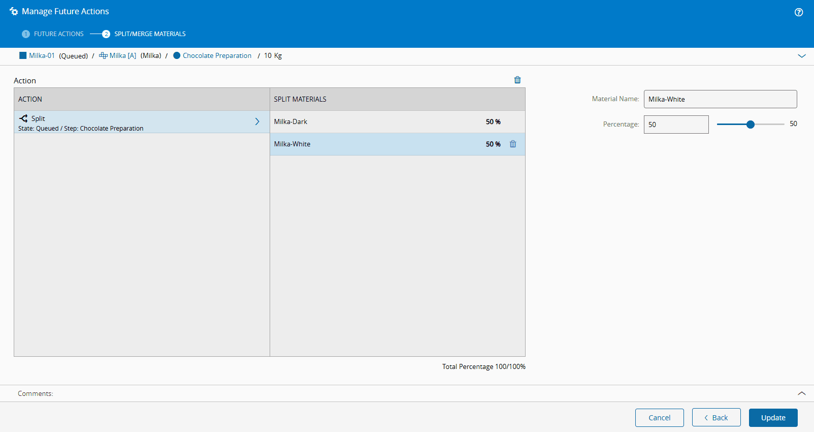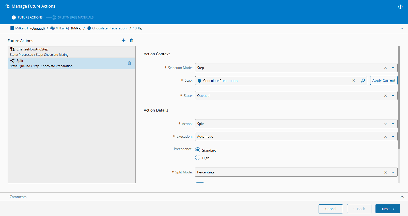 - Future Actions of type Split and Split For Step will need further specifications on the Split Mode, Type of Material and Quantity to be Split. For more information on how to define these criteria, see Step 2.