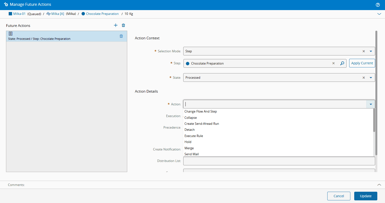 - For Future Actions of type Merge, Split, and Spilt For Step, specify for the Future Action: