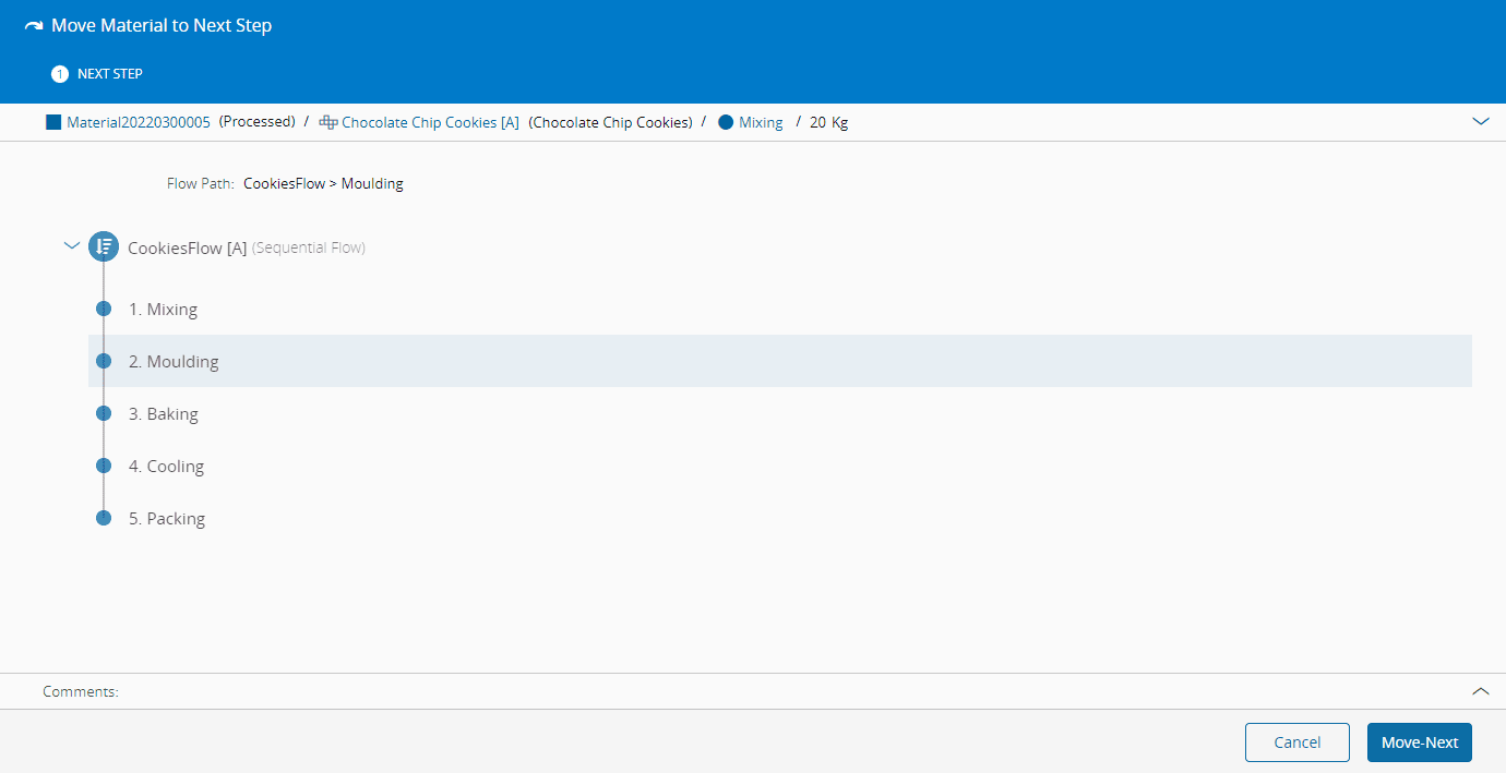 Material Move Next places the Material in a new Step in the Queued state. Usually, Material moves to the next Step defined in the Flow. There are cases, however, when there are more than one possible next Steps due to alternate Flows and optional Steps.