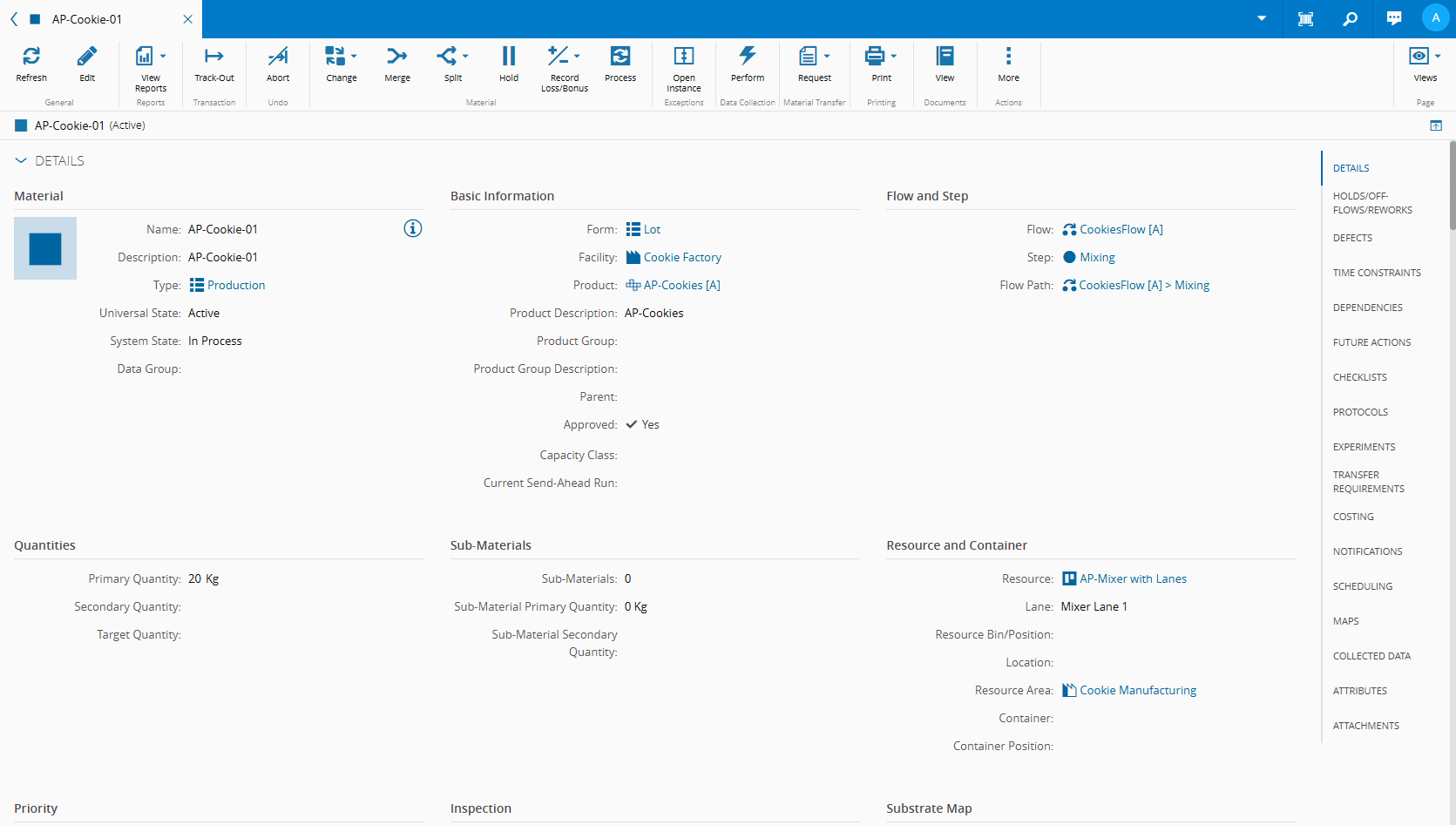 The Line Flow view displays a quick overview of the context of the Material that is currently being processed in a Step belonging to a Line Flow. Information is split on several panels: