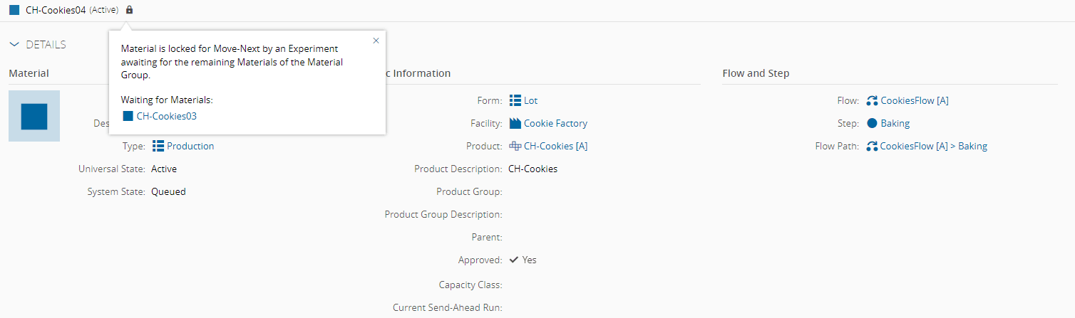 When a Material awaits an Experiment, a lock badge will appear next to its name. If you select it, a pop-over message is displayed, as shown in the image below.