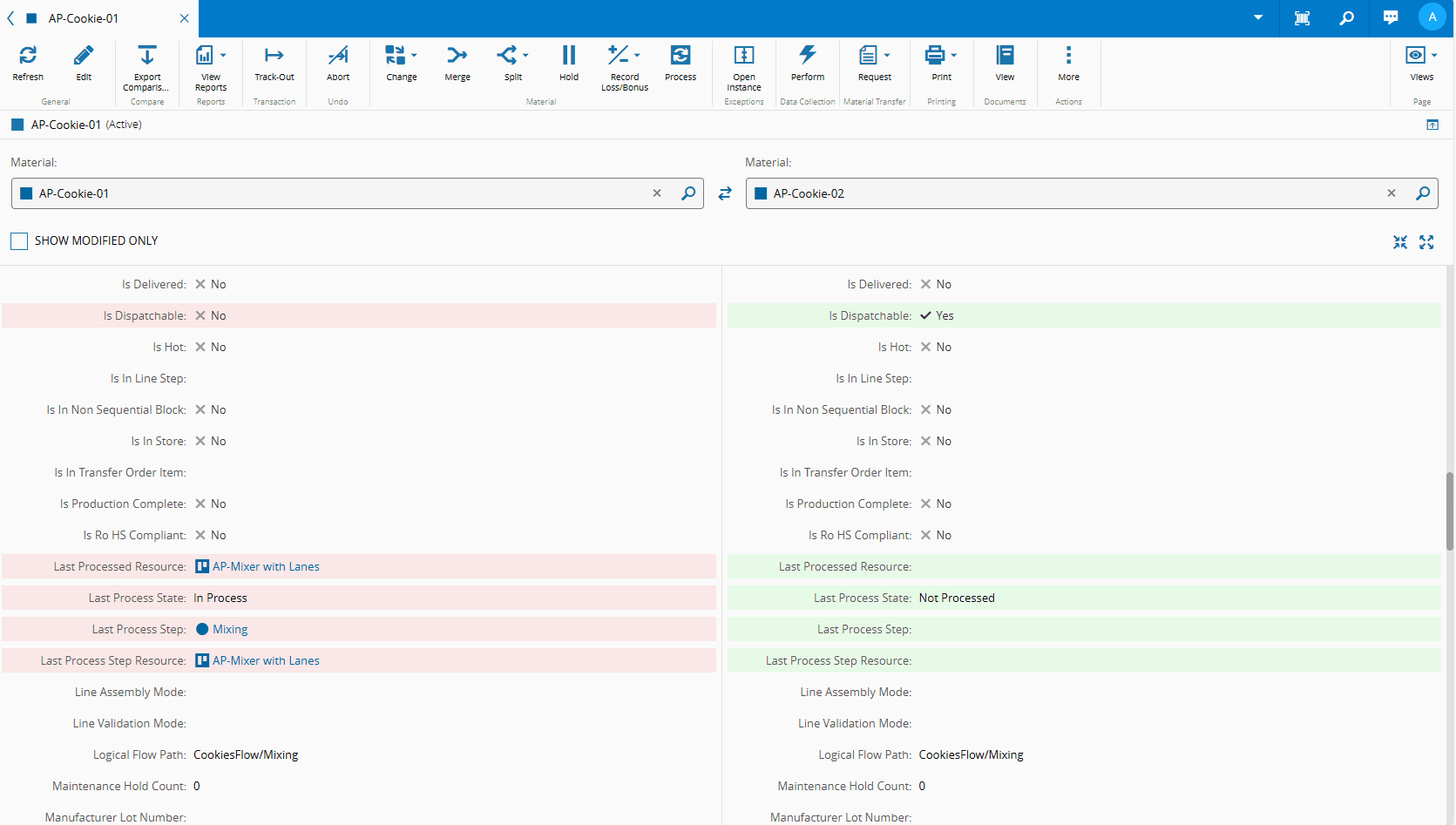 - Holds/Off-Flows/Reworks - displays information on the existing Material holds, off-flows and reworks.