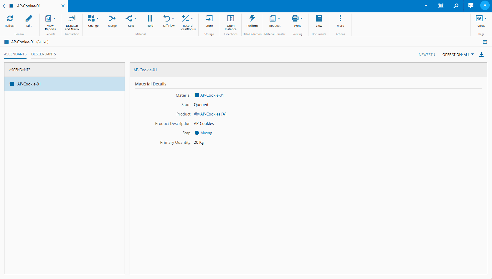 The Genealogy view displays information on the Ascendants and Descendants (Parent, Main, and Child Materials) of the Material.