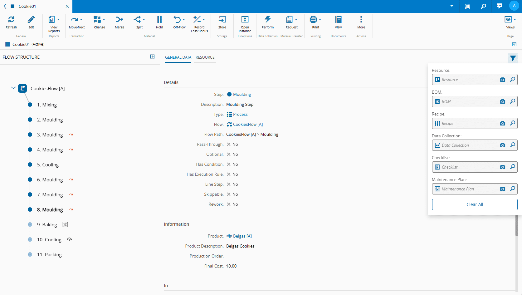 The Traceability view displays a quick overview of the history of the Material, with the Flow and respective Steps, together with a slew of information that when present will be divided into several different panels: