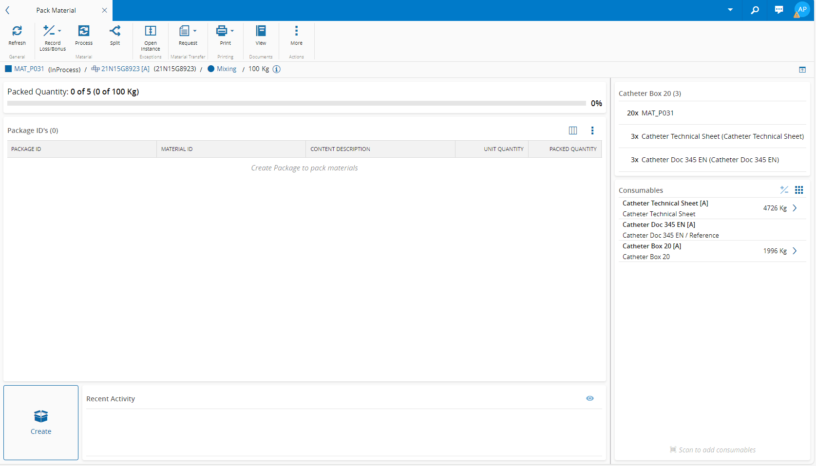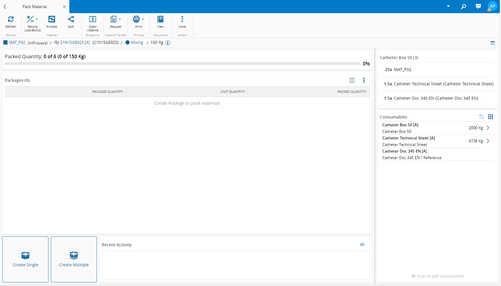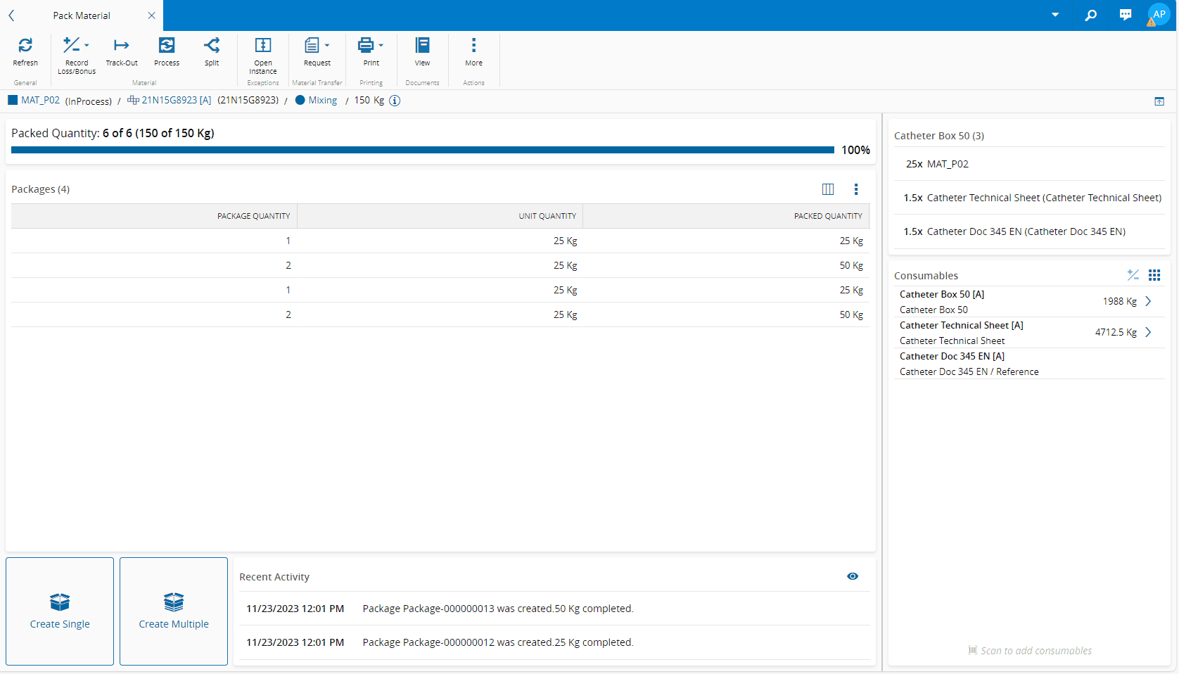 • Two Actions - in Material Quantity mode it is possible to Create Single or Create Multiple package(s).