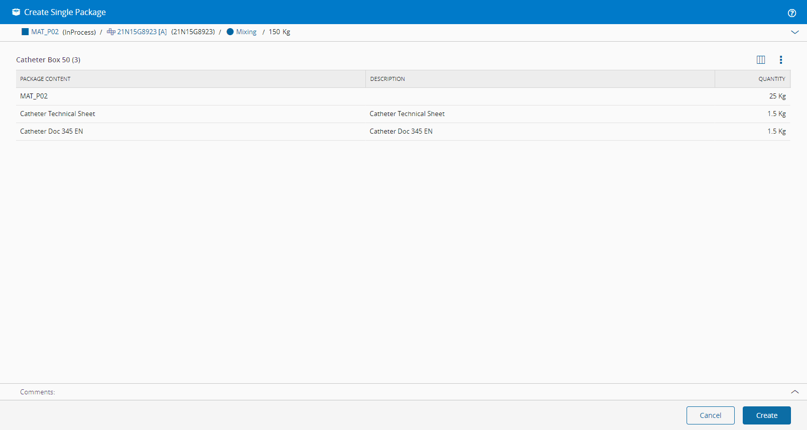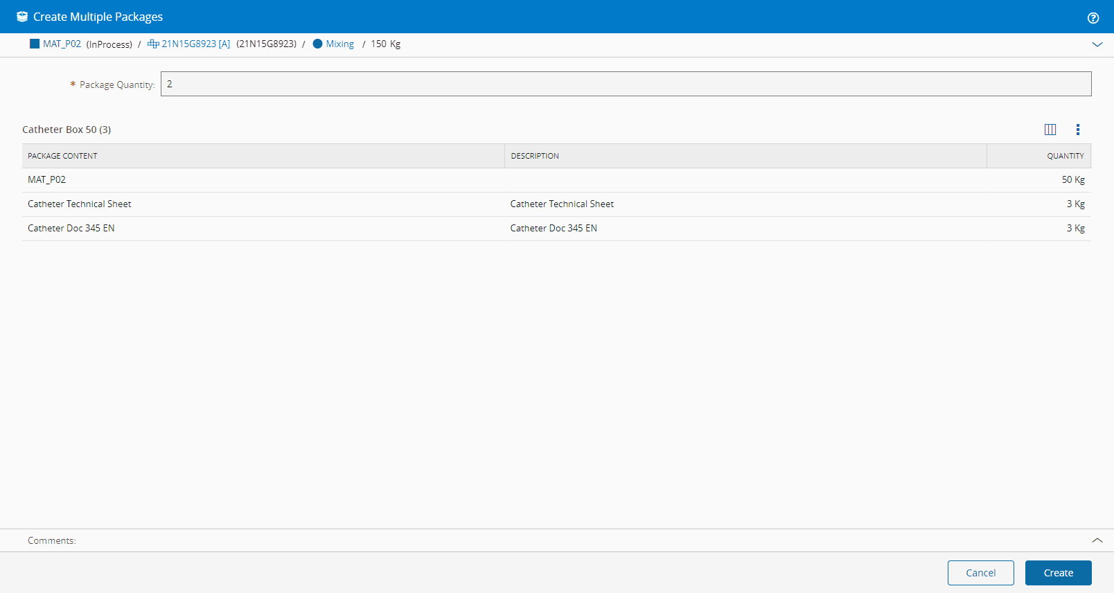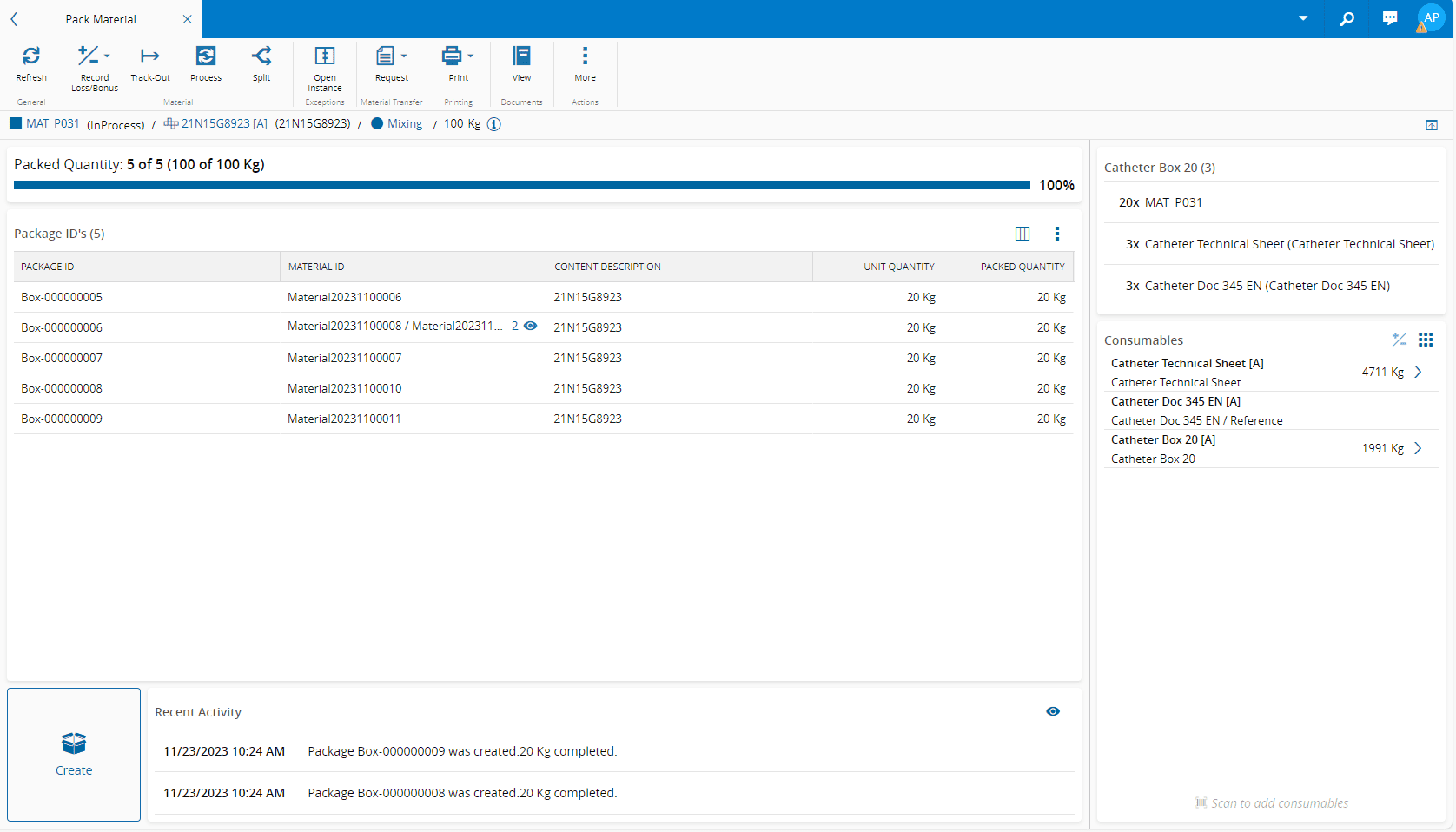 • Two Actions - in Material Quantity mode it is possible to Create Single or Create Multiple package(s).