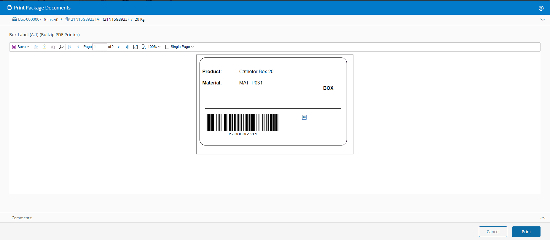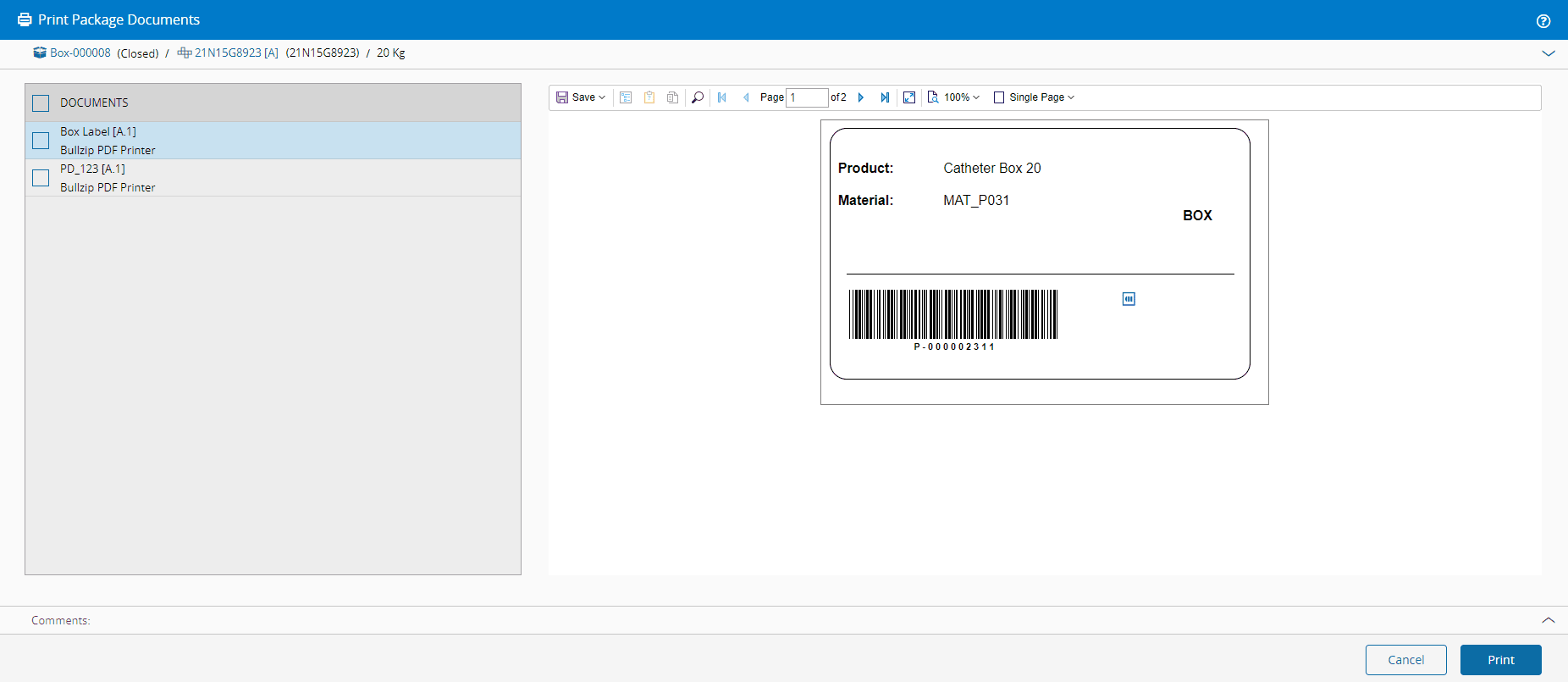 10. If configured in the MaterialPackingPrintableDocumentContext smart table, you can print the documents for the package that are associated with the Close Operation. Select the package, select Print on the top ribbon, and then select the appropriate option.
