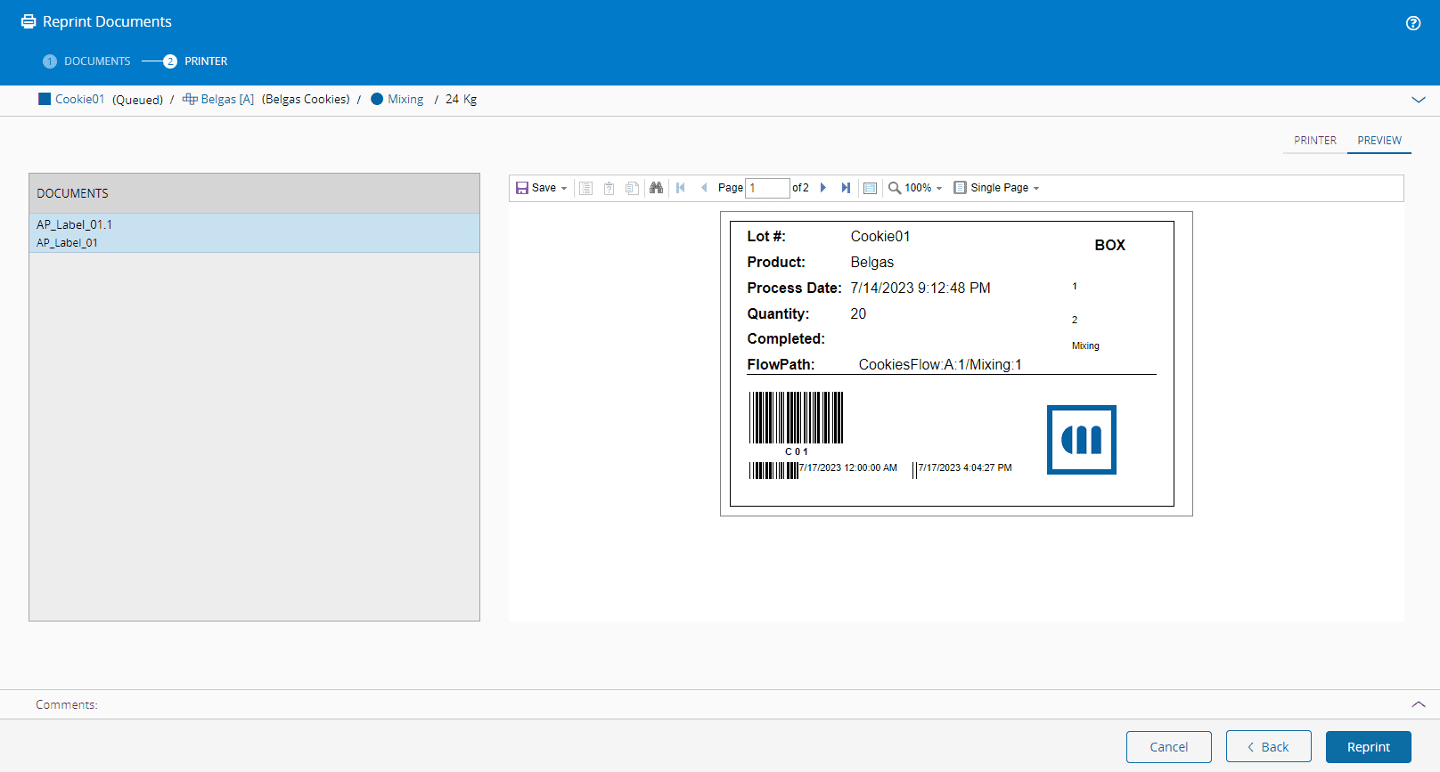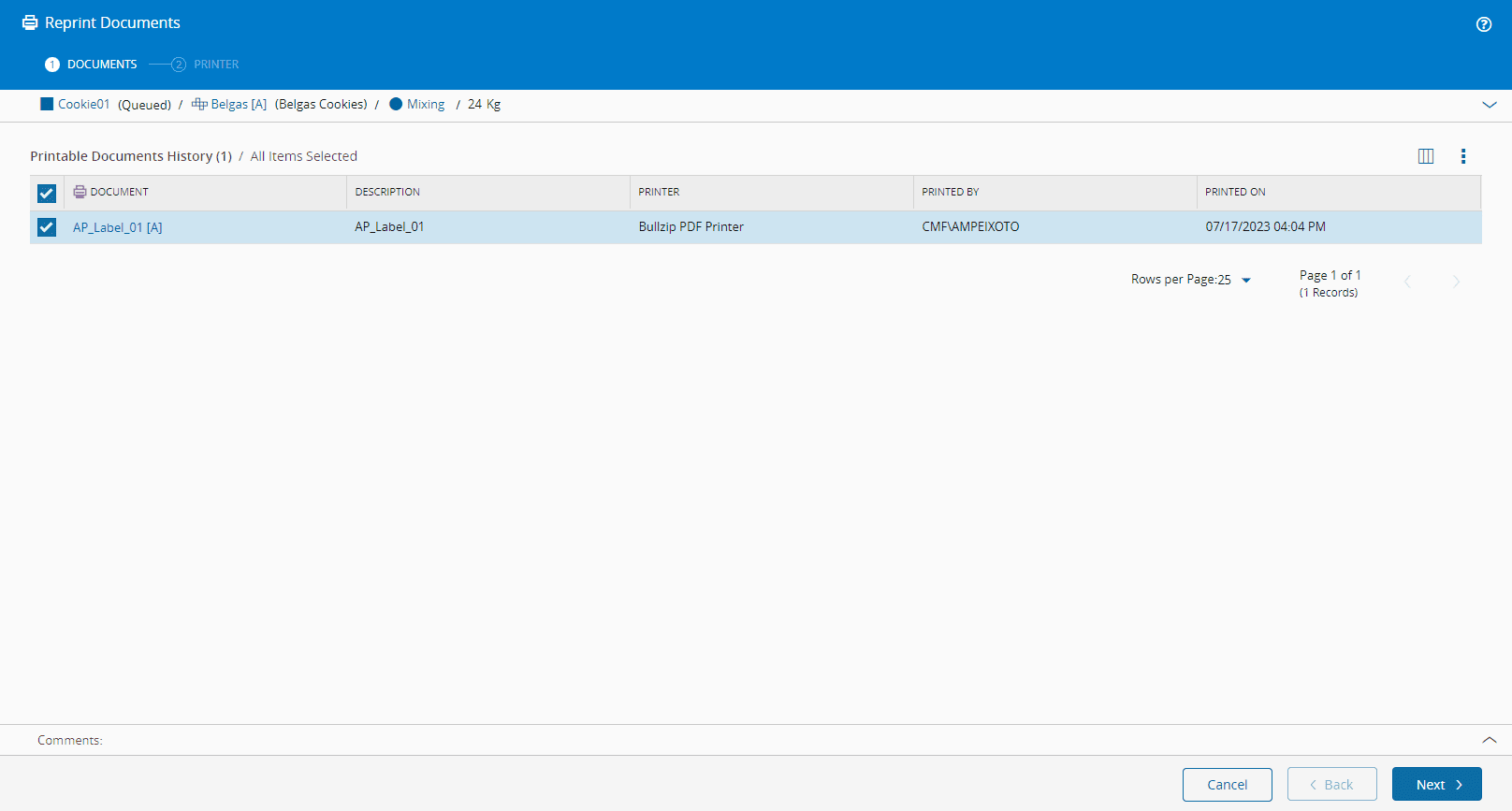 The Reprint Documents wizard will show a document or a list of documents that are associated to the Material and that are able to be reprinted.
