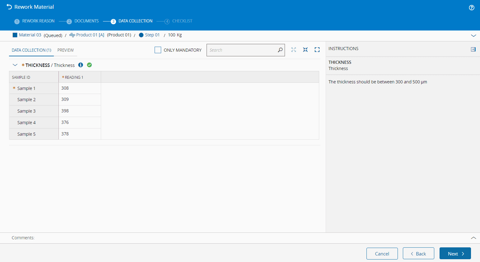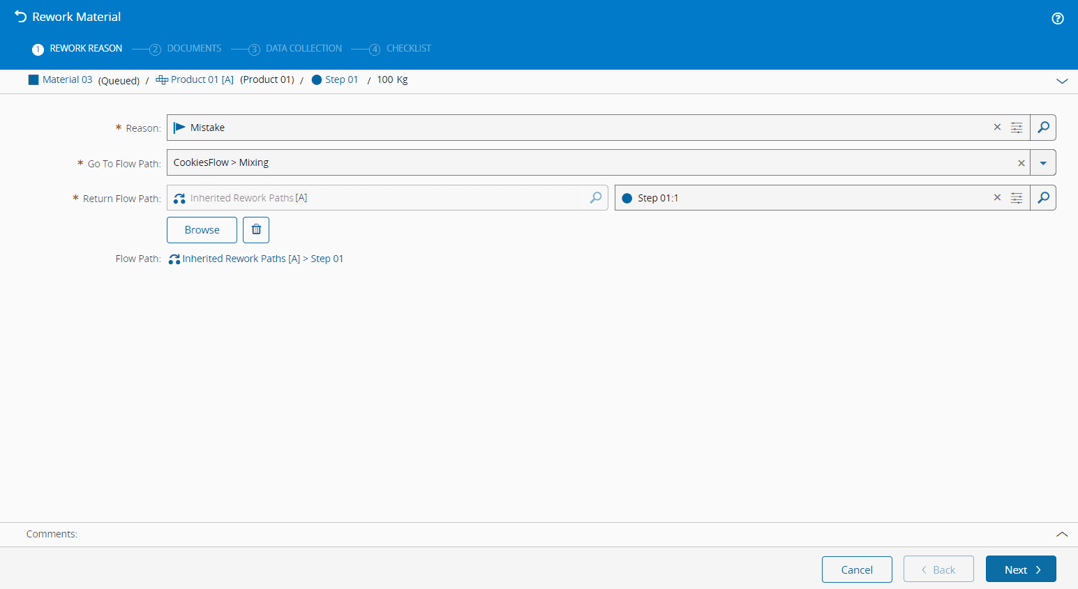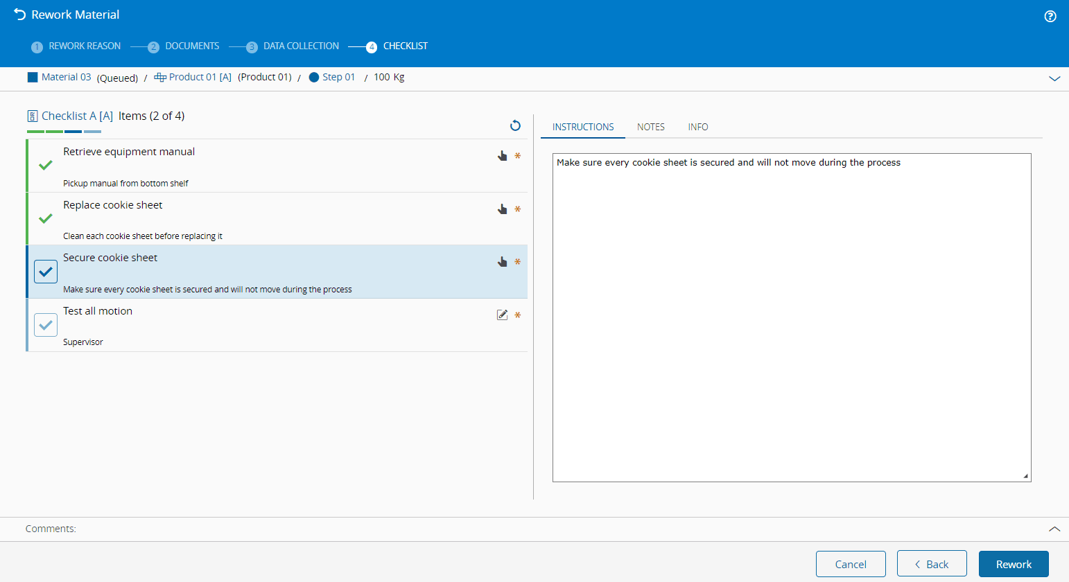 - Selected Rework Reason exists, is active and is currently assigned to the current Material Step and classified as applicable to Rework.