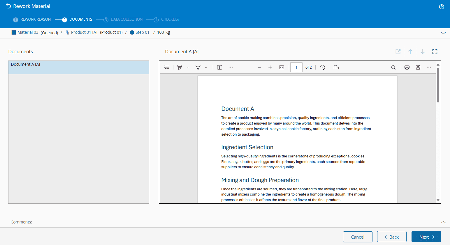 This step will only appear if there are Documents linked to the Material or the current Step. Documents can be configured either through the MaterialDocumentContext smart table or directly in the Step Context View. For more information, see Create Document.