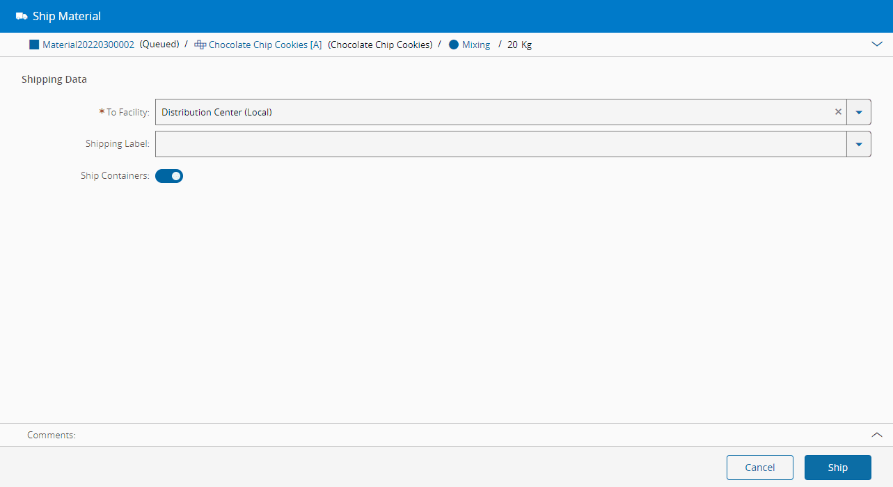 - Select the Facility to which the Material should be shipped.