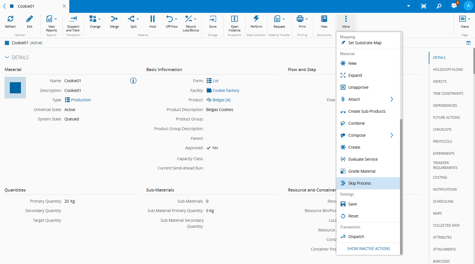 - When selecting multiple Materials, ensure that they are all located in the same Facility and at the same Step.