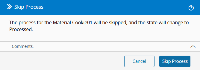 This operations allows a Material to bypass processing at a specific Step, so the Material will automatically change from Queued to Processed state while remaining at the same Step. This is particularly useful for Sub-Materials that skip a specific Step, enabling them to be set to the Skipped/Processed state for that Step. Meanwhile, Sub-Materials requiring processing at the Step can proceed as needed, allowing all Materials to be merged at the end of the Step.