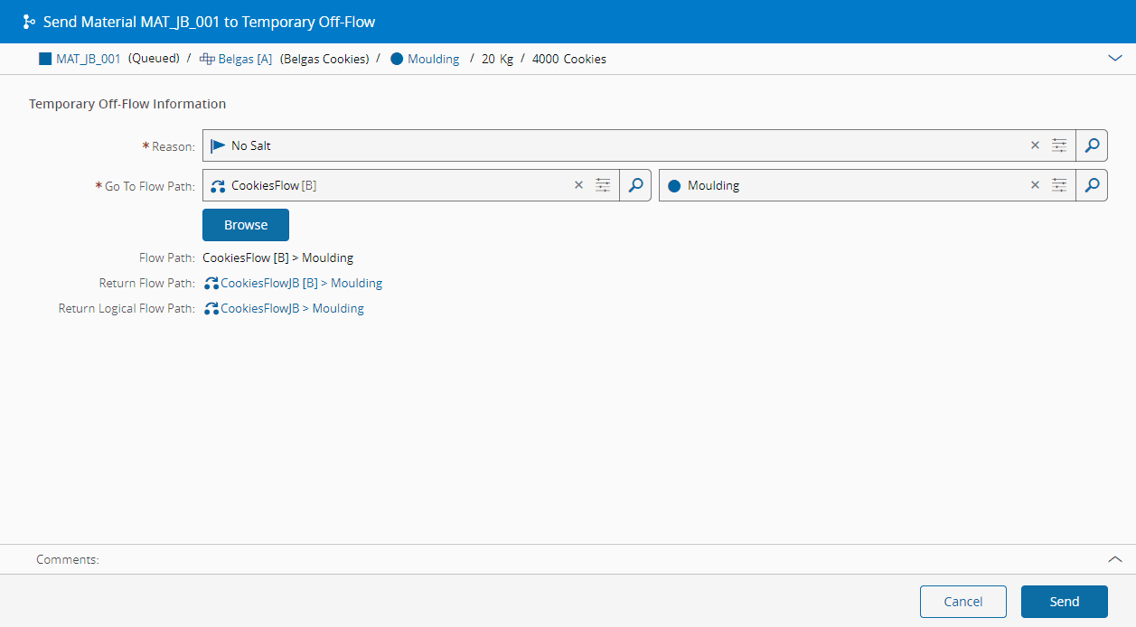 - Selected Temporary Off-Flow Reason exists, is Active and is currently assigned to the current Material Step and is classified as applicable to Temporary Off-Flow.