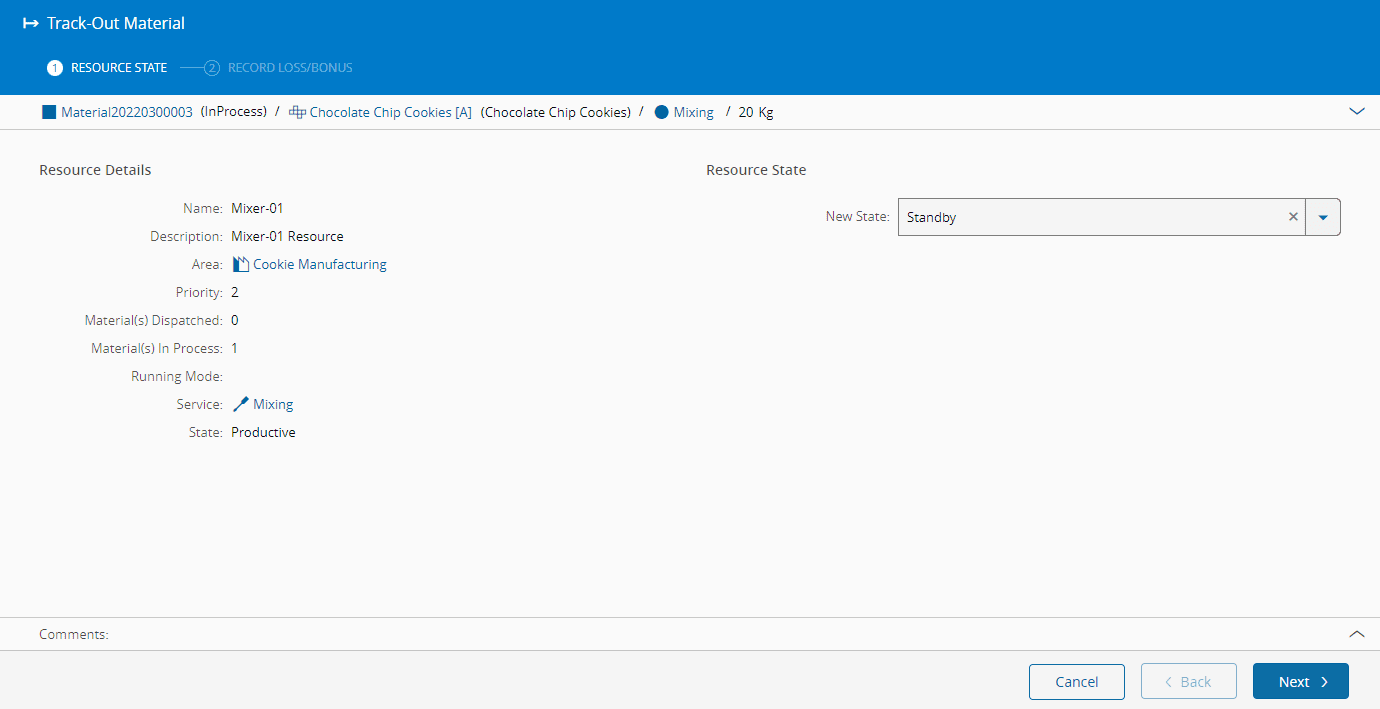 This operation is used to track out a Material. A track out means that the Material has completed processing at a given Resource. This transaction is available from the Resource and Step View.