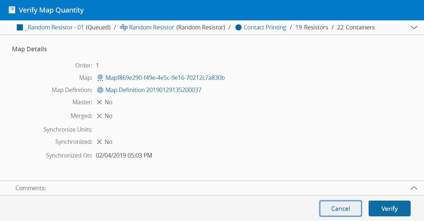 This operation is used to verify whether the Material quantities are the same as the Map quantities. The system will perform a check and provide an indication for the user on if the quantities match or not.