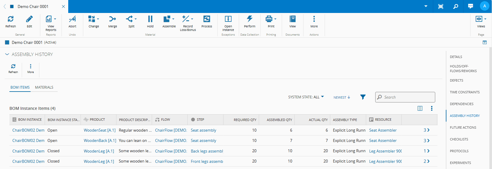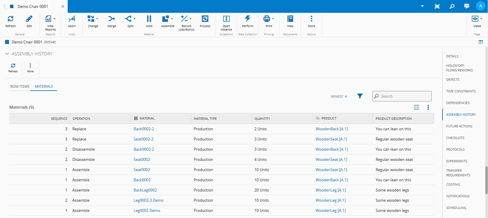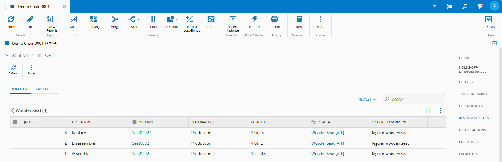 This operation is used to view the full Material Assembly History for a given Material. It will include a list with all the BOM Instance Items, and a list of all BOM Items and Materials for a given Material.