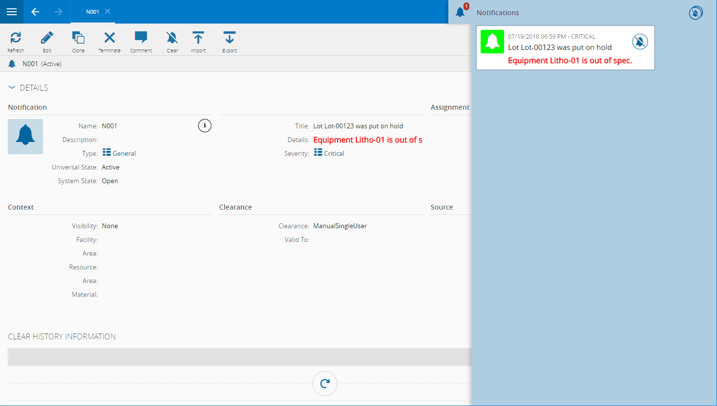 1. To clear the Notification select Clear in the Notification details page or in the Notifications pane on the right of the screen.