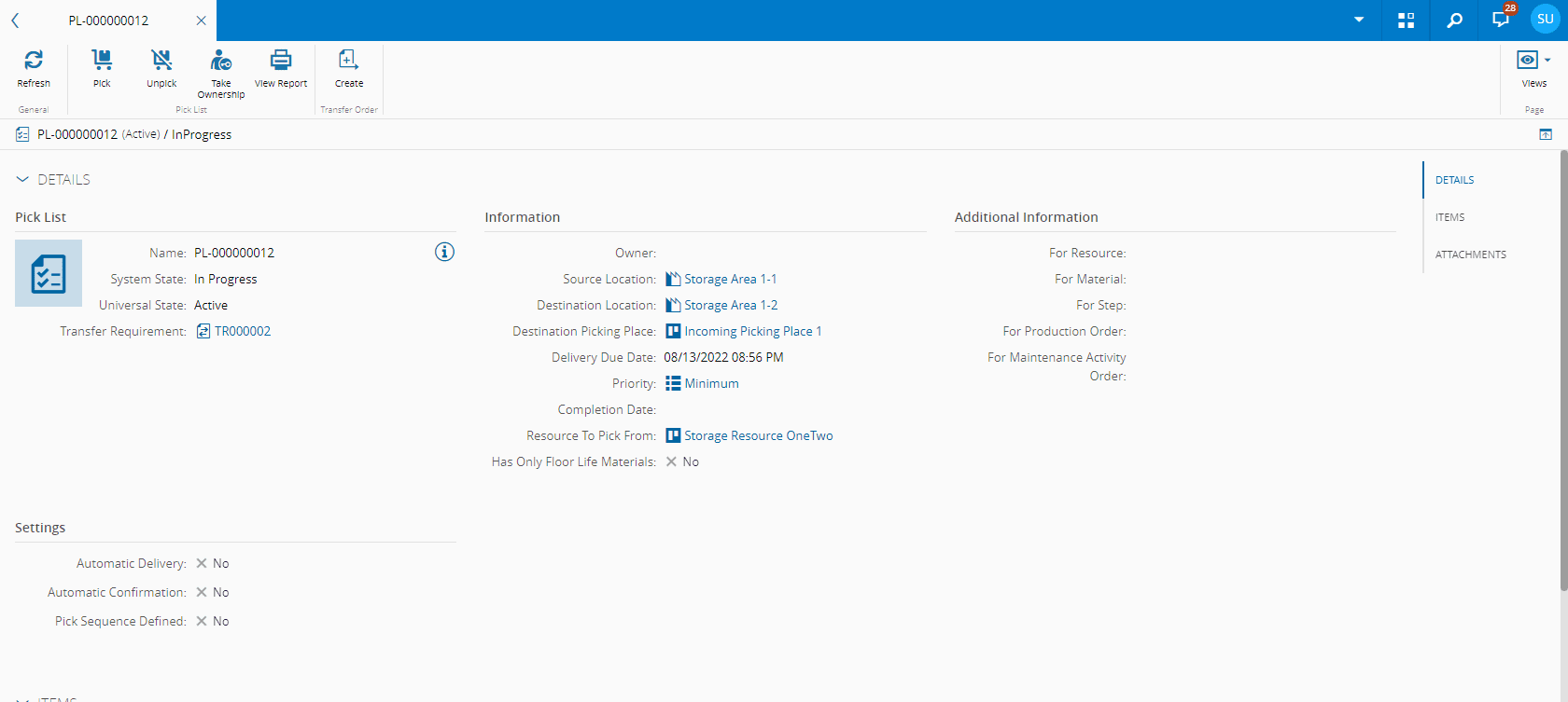 - Items - shows the items that form the Pick List. Separate lists of the Transfer Requirement and Transfer Orders associated to the Pick List are also displayed.