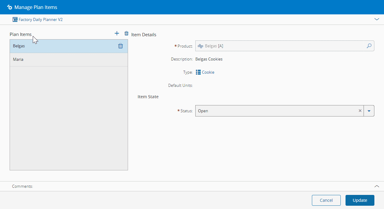 - Open - The Plan Item is underway and the production is being controlled in the Plan.