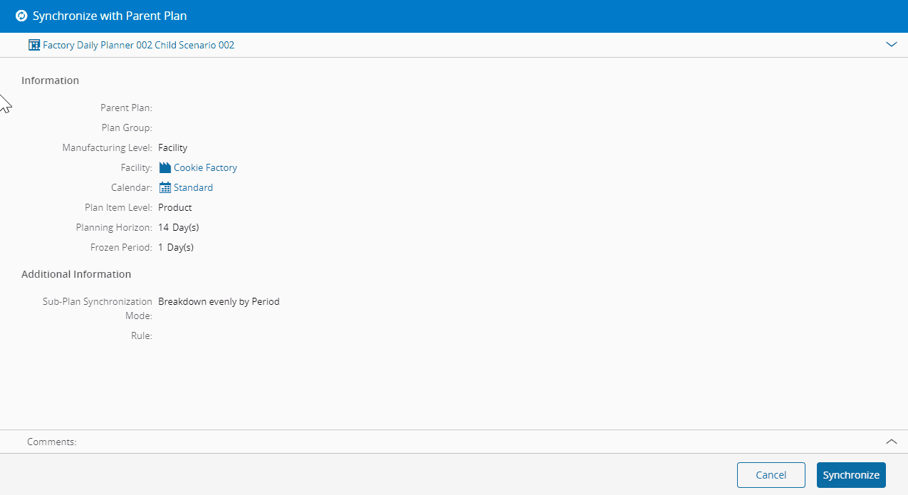 You can perform the Synchronize Scenario with Parent Plan operation from the Synchronize button located on the top ribbon of the Plan Scenario page.