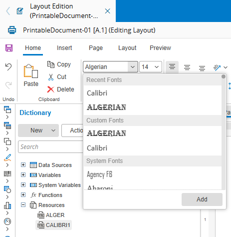 When the Custom Fonts are available, they will be displayed under the Resources section and in the Fonts dropdown: